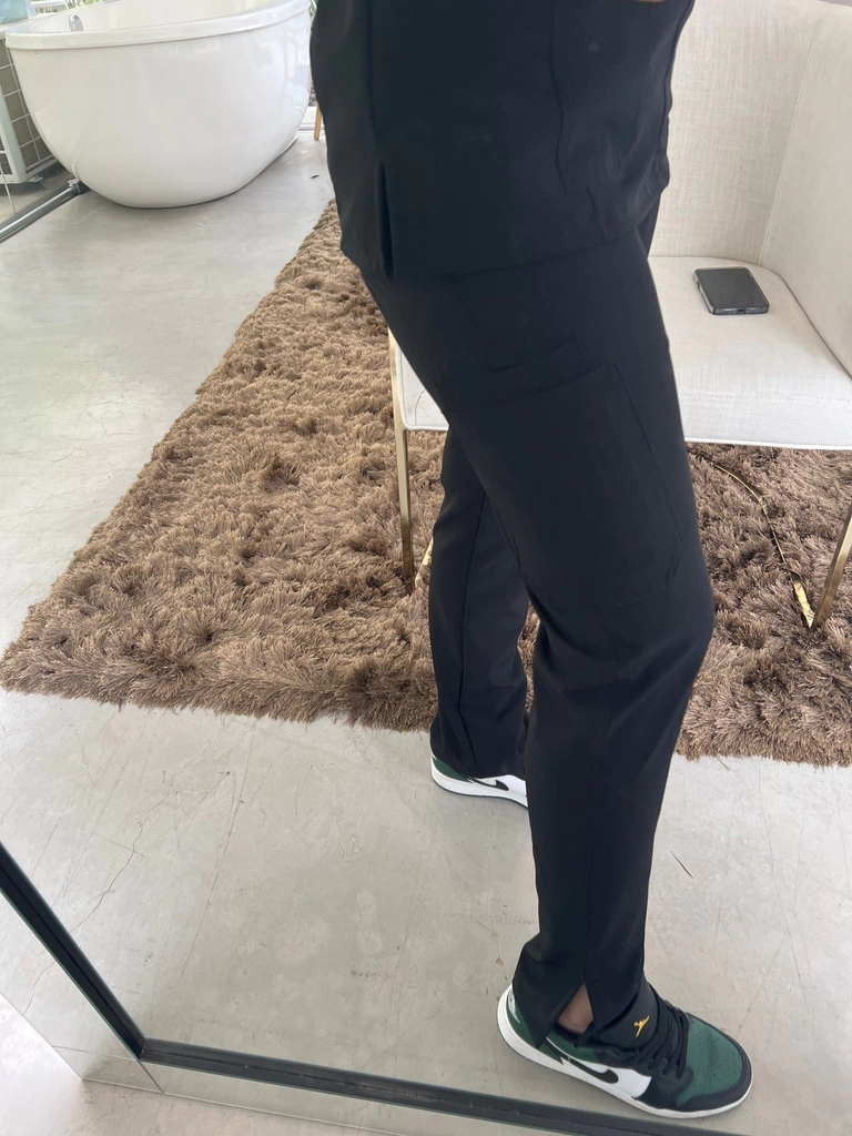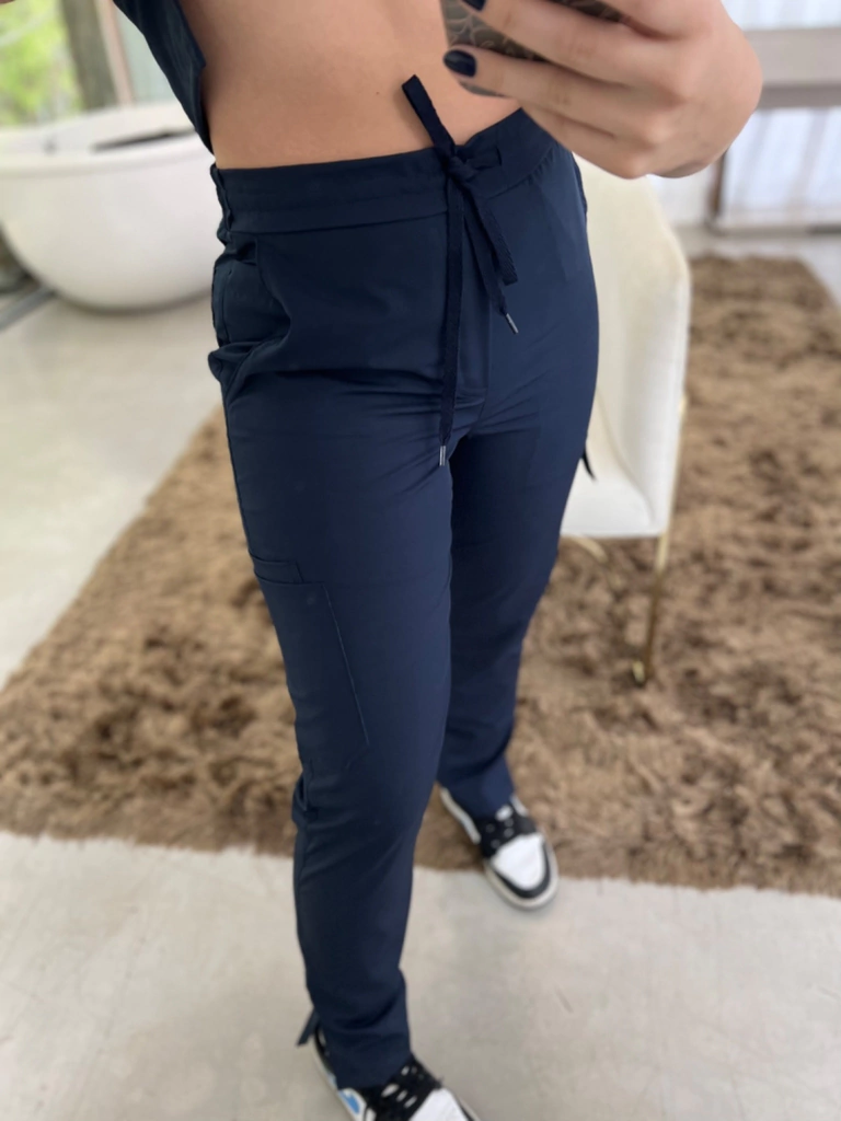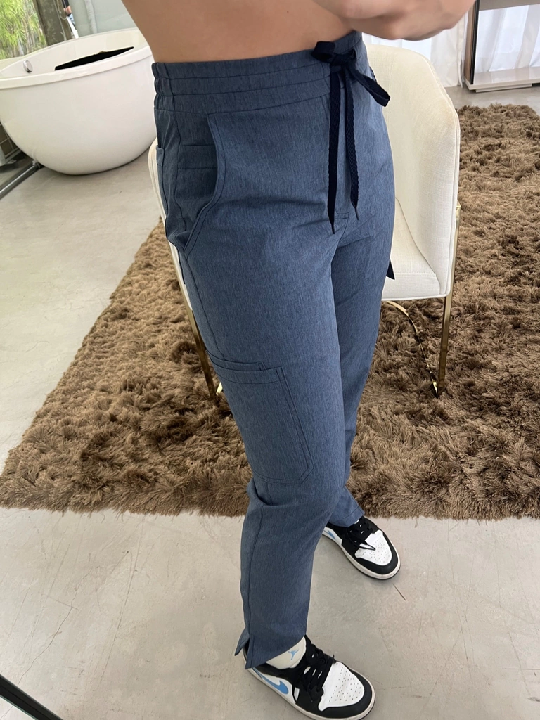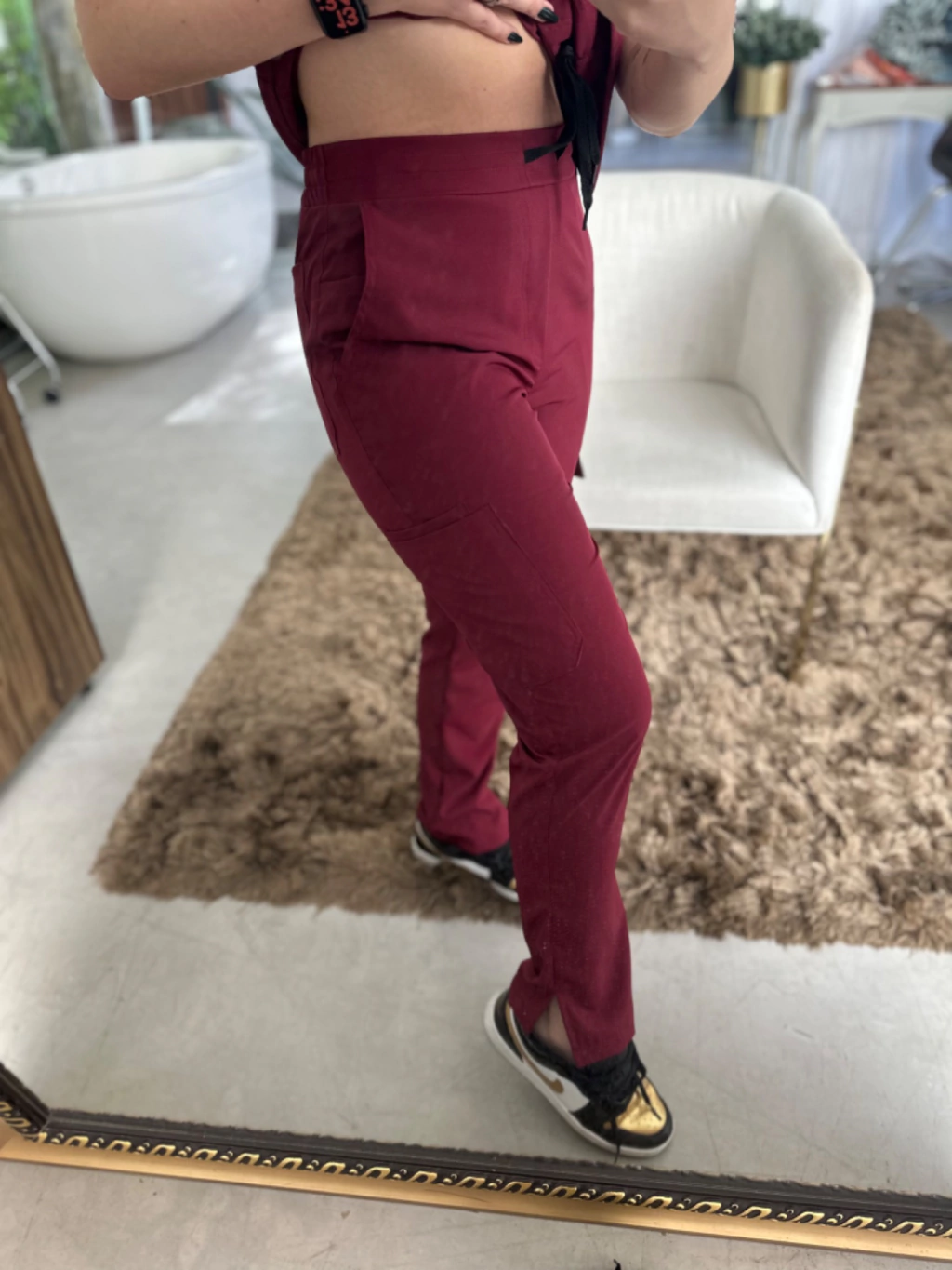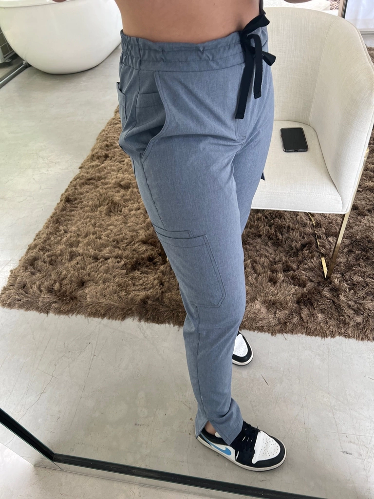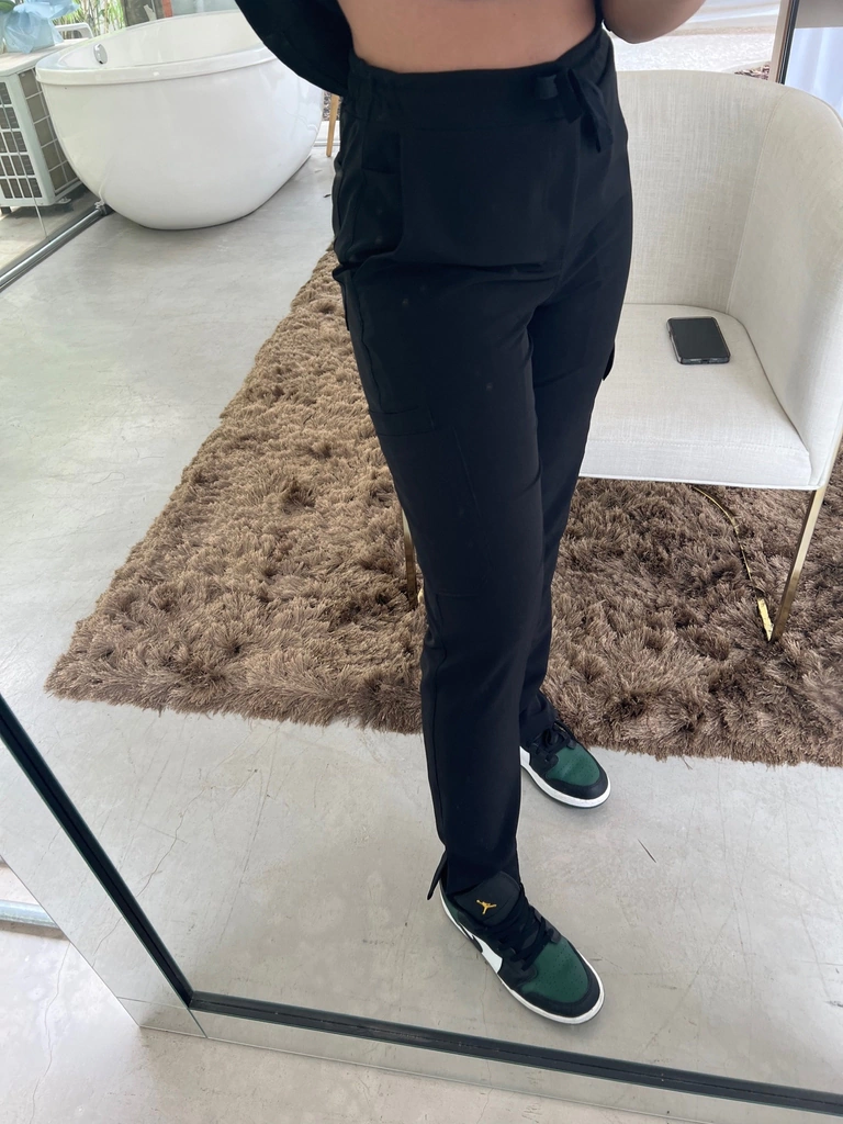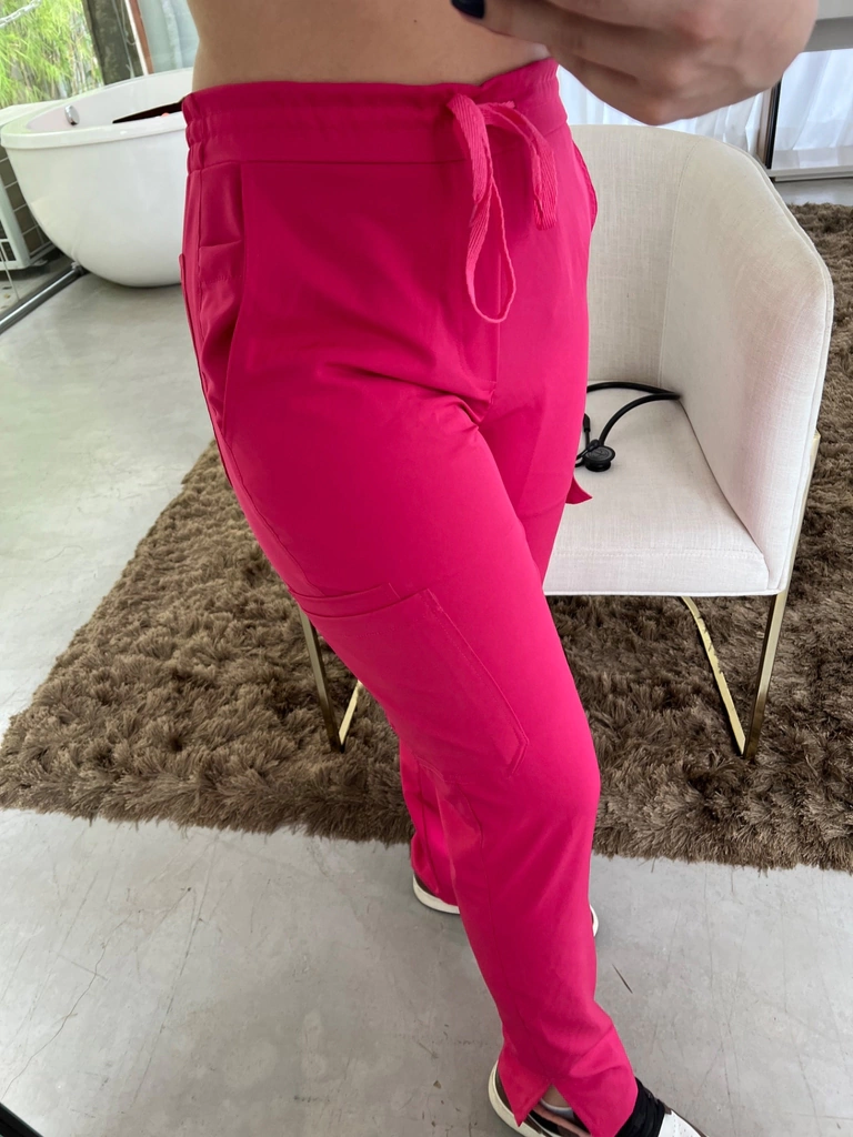 Calça com 2 bolsos posteriores , 2 bolsos laterais e 3 bolsos em perna , boca reta com abertura lateral